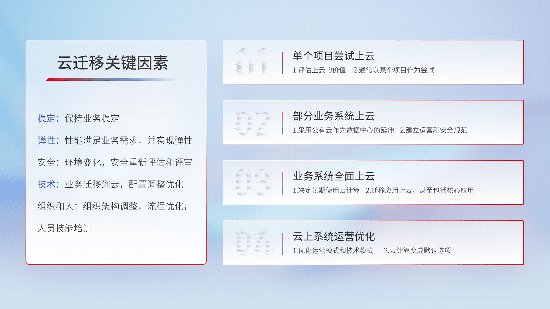 结合实际业务,,,从规划设计、、、、云平台选型、、、、云原生改造、、、、数据迁移、、集成交付,,迁移全过程为客户识别最佳上云路径,,,做好风险识别管理,,设计网络架构、、身份权限、、、、安全审计合规、、、、操作审计、、、日志审计、、、监控告警策略、、、、多站点容灾设计等,,,对云上基础设施进行整体规划,,,,提升IT治理水平,,,以满足弹性、、、高可用、、高性能的需求。。