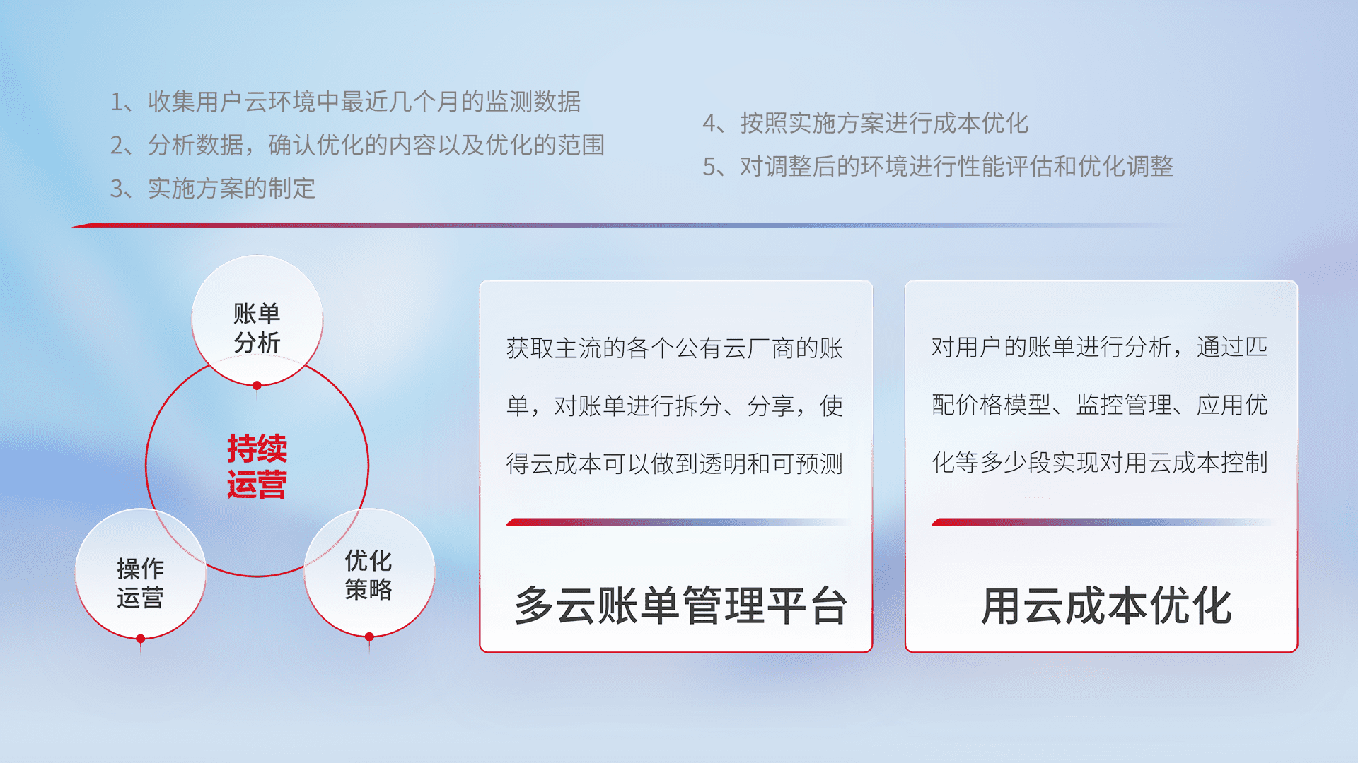 通过多云纳管,,以统一的资源数据模型把客户的云资源进行抽象和封装,,进而实现对多云资源的统一操作,,保障云资源管理的可靠性、、、稳定性与可用性。。。。量身定制化运维内容,,配置、、、开发运维、、、补丁管理、、备份、、、、监控、、、、认证和访问管理、、、、审计和日常巡检等,,,,保障在用云过程中的可靠度,,,,稳定度以及高可用率。。